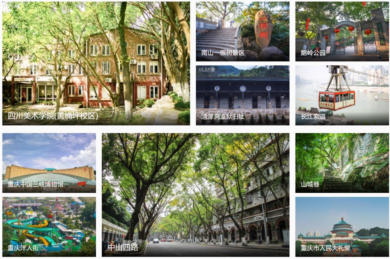 沙坪坝区:有磁器口、渣滓洞、白公馆、歌乐山公园、三峡广场、川外小铁路、熙街;