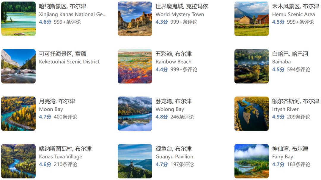 禾木晨雾→喀纳斯三湾秋色→白沙湖芦苇季→五彩滩落日