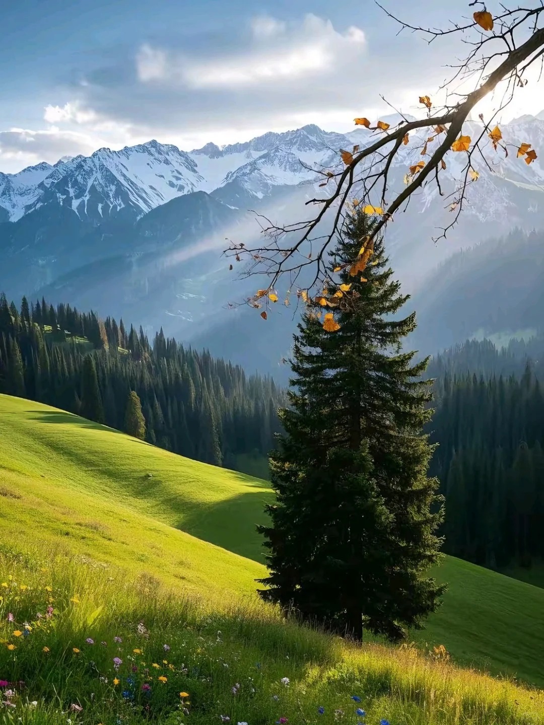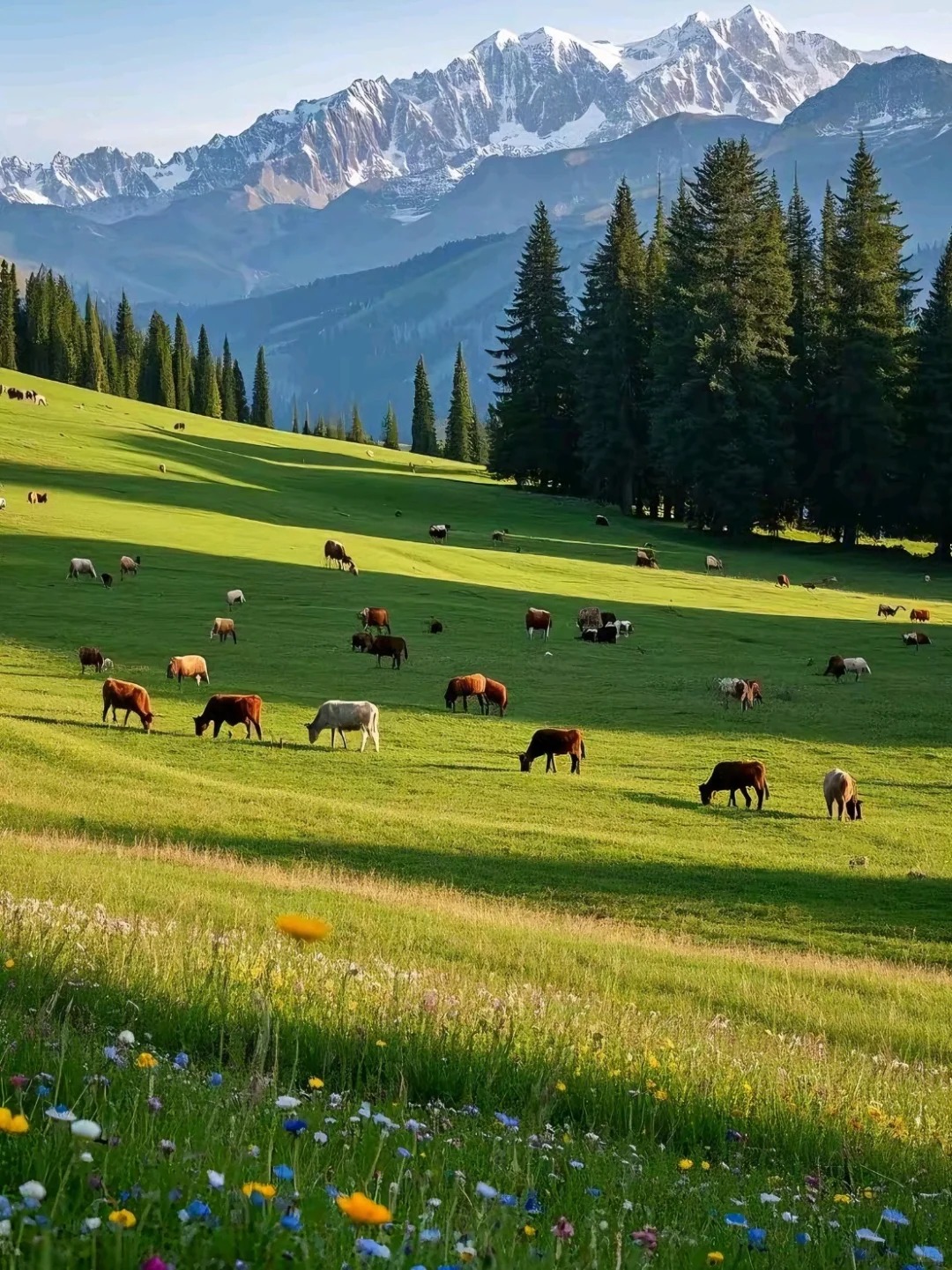 5.0星:3D立体画卷。 那拉提最大的特点是“层次感”。不同于内蒙古一望无际的平原草场,这里的景观是垂直分布的:脚下是绿毯般的草甸,中间是墨绿挺拔的雪岭云杉,远处是终年积雪的天山山脉。特别是“空中草原”线路,车行山脊之上,视野极度开阔,仿佛伸手可触云端。日落时分,光影在起伏的山峦间流转,视觉效果极佳。