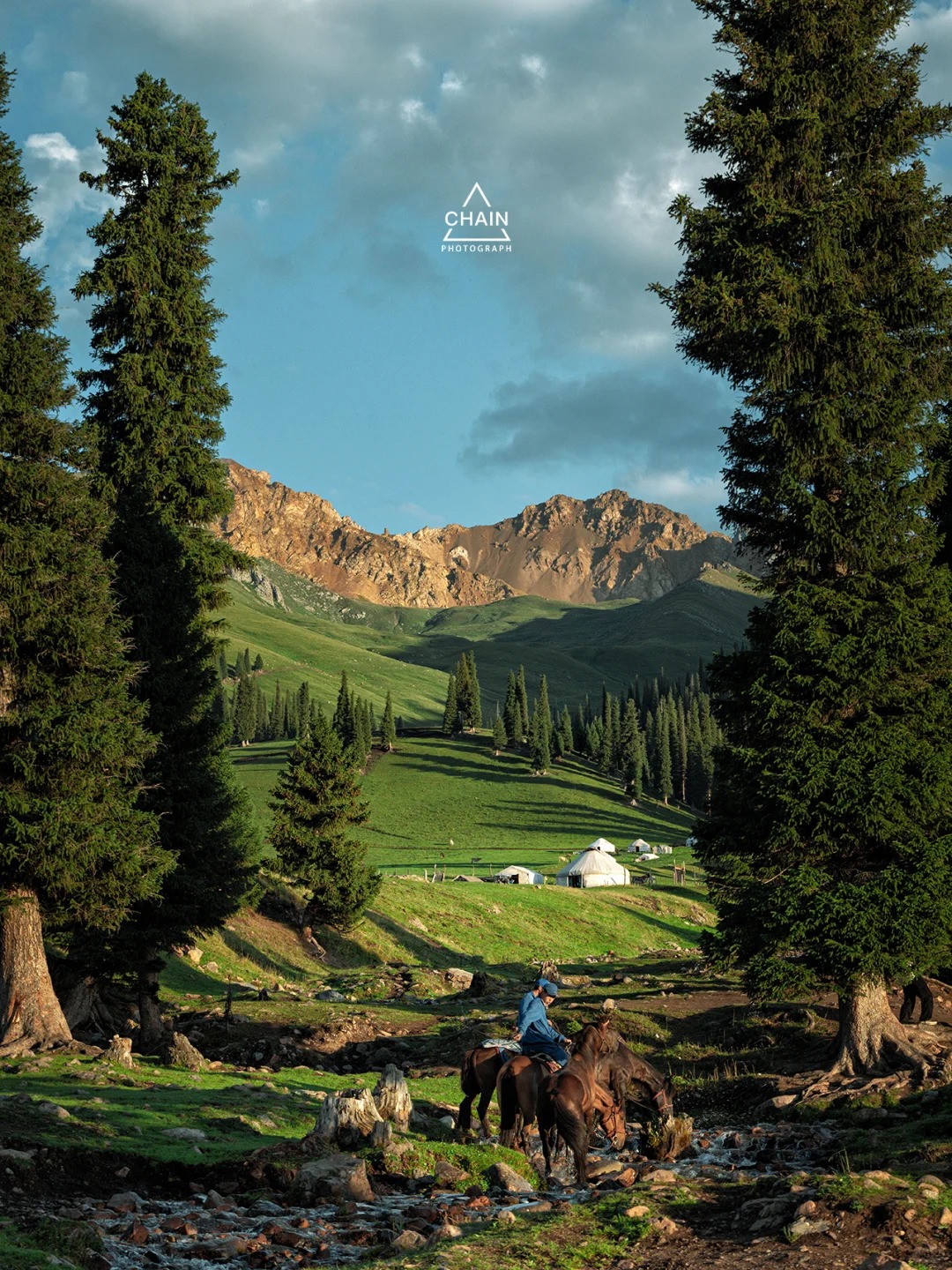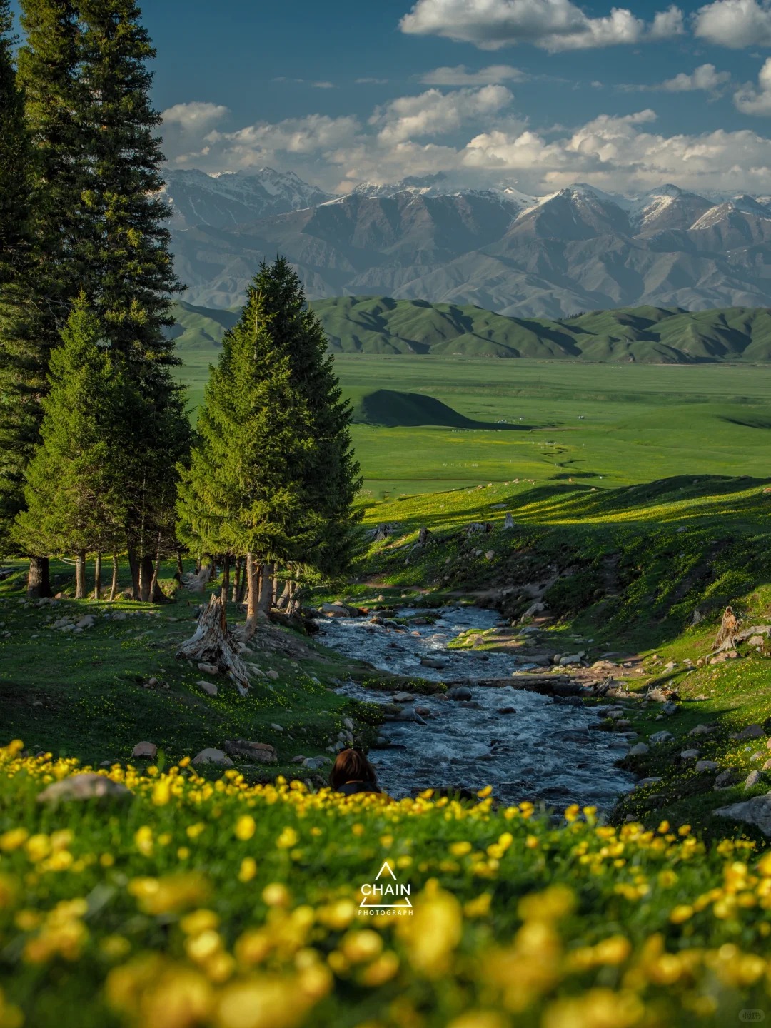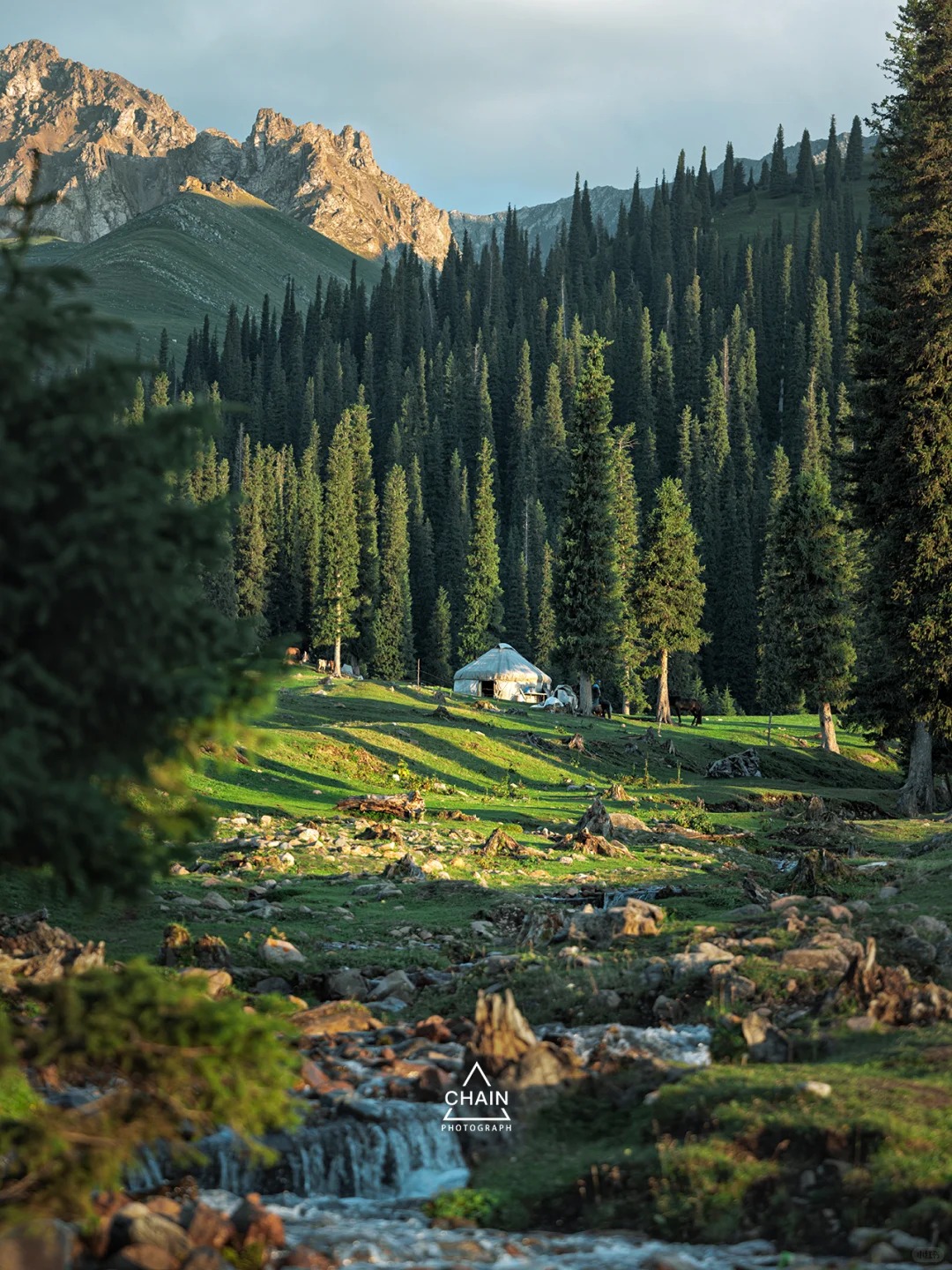“游牧人家”是空中草原线路的终点站,也是视野最好的地方。傍晚时分,夕阳会将连绵起伏的绿色草原染成金色,雪山顶也会呈现出日照金山的效果,拍照出片率100%。